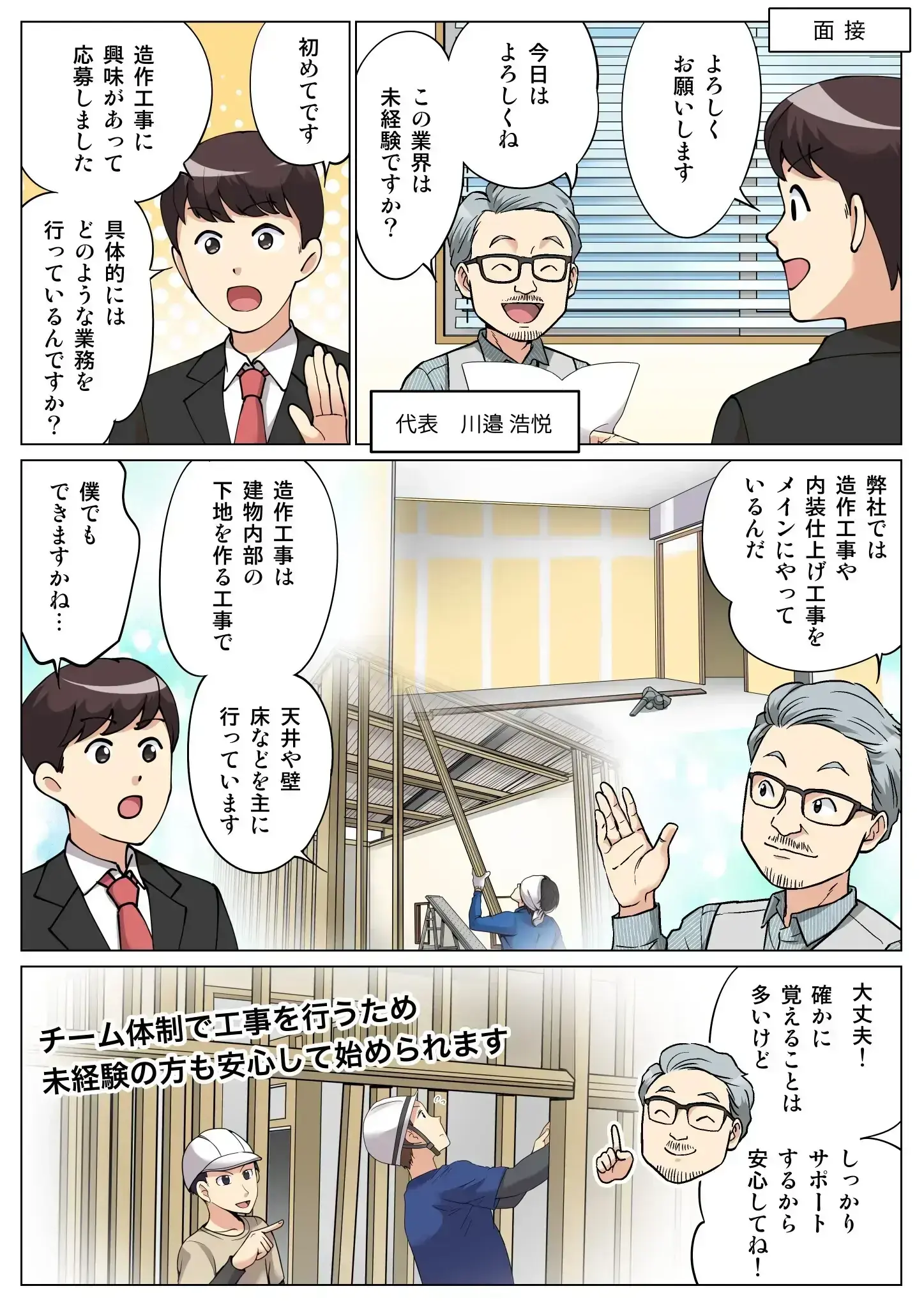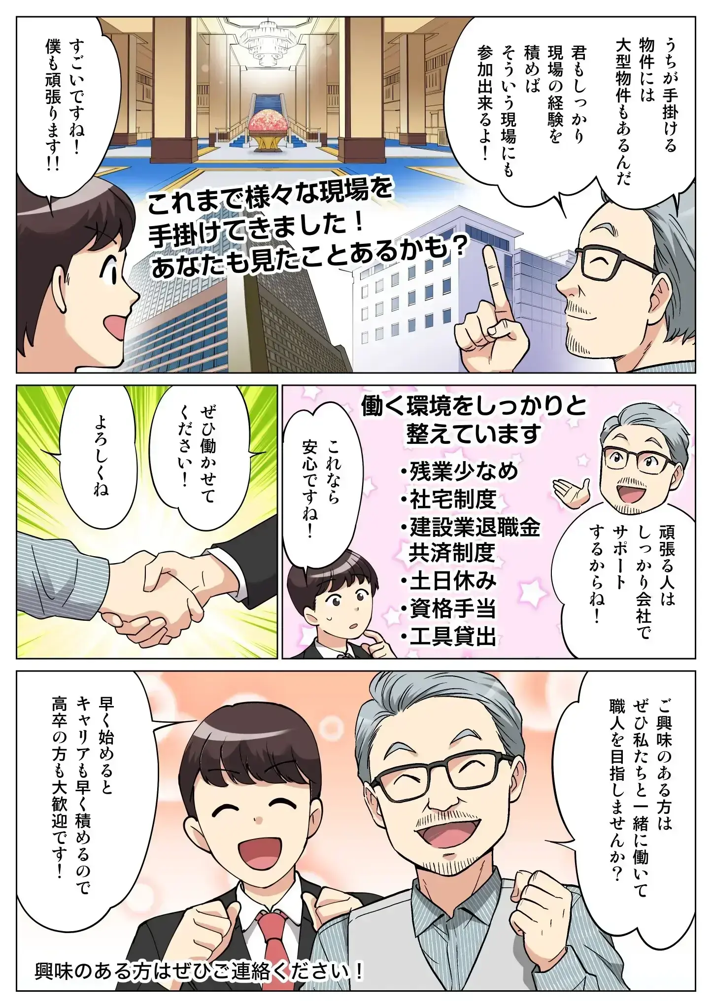 残業はほぼなく、その日の仕事が終われば退社できます。プライベートを充実させながら仕事も頑張りたい方にぴったりです。川邉建装での仕事を通じて、ワークライフバランスを実現しませんか。